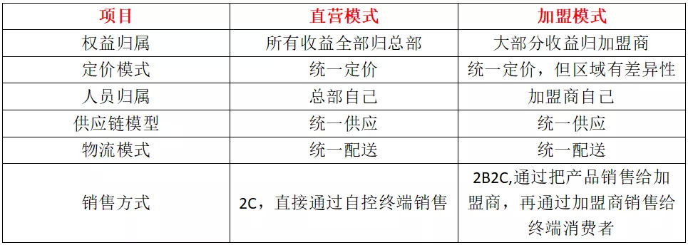 通过上面的图片,我们可以清晰地发现直营模式和加盟商模型在商业模型设计上是完全不同的,所以我们明显发现直营和加盟两种模型不同的优劣: