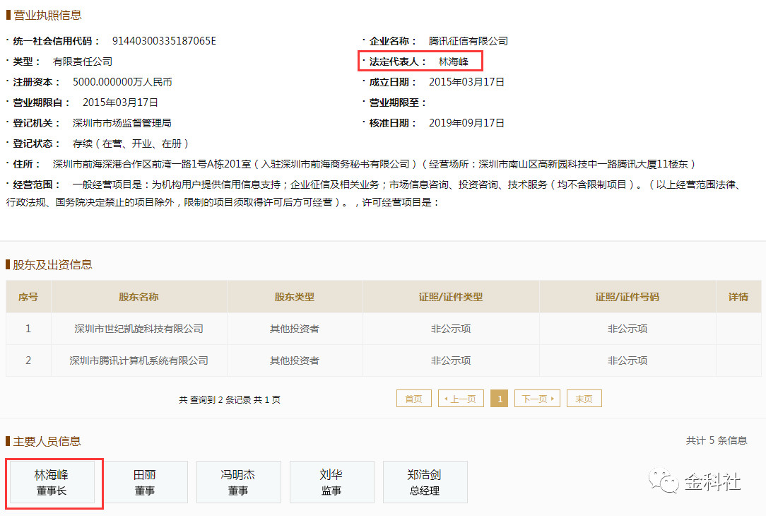 国家企业信用信息公示系统显示腾讯征信有限公司法人代表已经更新为林海峰(金科社截图)