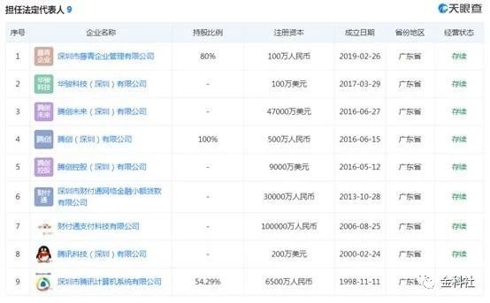 马化腾仅担任9家“腾讯系”公司法人代表(金科社截图)