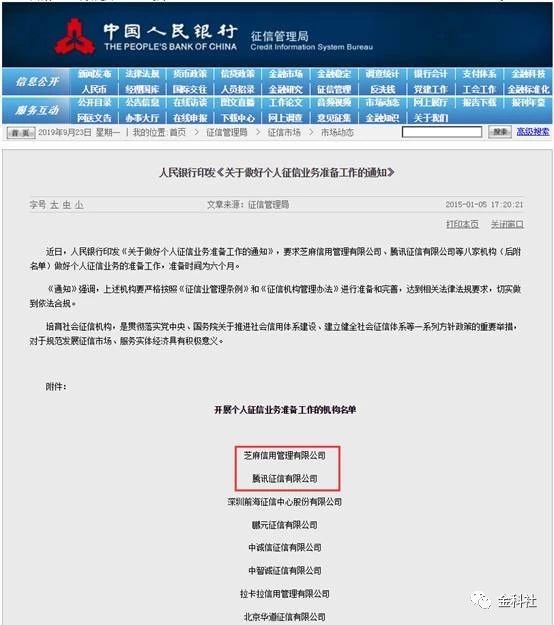 中国人民银行下发《关于做好个人征信业务准备工作的通知》,腾讯征信、芝麻信用在列(截图来自人民银行网站,金科社截图)