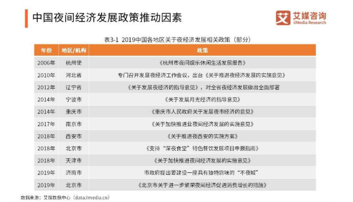 不少城市着眼于推动城市消费格局的变迁,也出台了许多繁荣“夜间经济”的政策措施。如上海市颁布《关于上海推动夜间经济发展的指导意见》,推出“夜间区长”“夜生活首席执行官”等统筹协调发展“夜经济”的专职职位。济南提出建设一座具有独特韵味的“不夜城”。天津提出在2019年年底前打造形成6个市级夜间经济示范街区等等。
