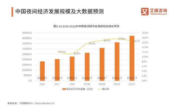 iiMedia Research(艾媒咨询)研究发现,中国夜间消费约占总体零售额的六成,并持续以约17%的规模增长,是拉动中国内需的重要抓手。特别是中国互联网及移动互联网相关产业的发展,极大地丰富了线上线下的实物经济与虚拟经济产品,为中国夜间经济发展创造机遇。
