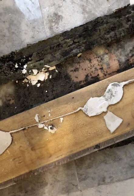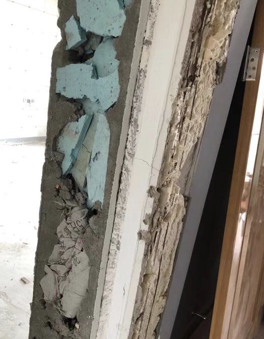 为了能赶上孩子的上学时间,这位业主在今年3月收房后重新修了地板和墙纸。但7月准备入住时,他发现房间里的霉菌味道一直未散尽,这才发现门套、电视机背景墙、主卧室背景墙等都是由泡沫板、垃圾袋等填充。正是这些泡沫板、垃圾袋和纸板造成了霉菌味道。
