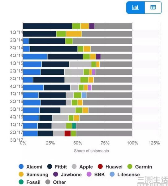 不过这种不把用户放在眼里的做法,并不是Fitbit走到今天的重要原因。在这一年中,以性价比闻名的国内品牌小米入局这一市场,苹果则看上了智能手表业务,并推出了Apple Watch,因此Fitbit在智能可穿戴市场的两大分支中也都迎来了强力挑战者。