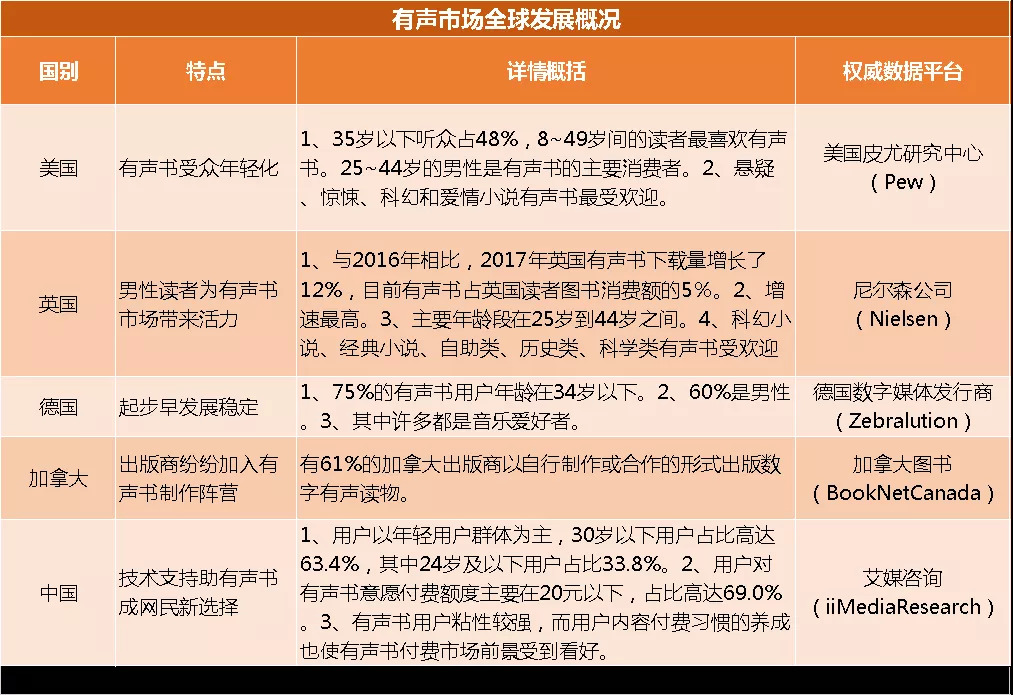 根据华经产业研究院发布的《2019-2025年中国有声书行业市场调查研究及投资前景预测报告》显示,从全球范围看,有声书已超越电子书成为出版增速第一的板块。