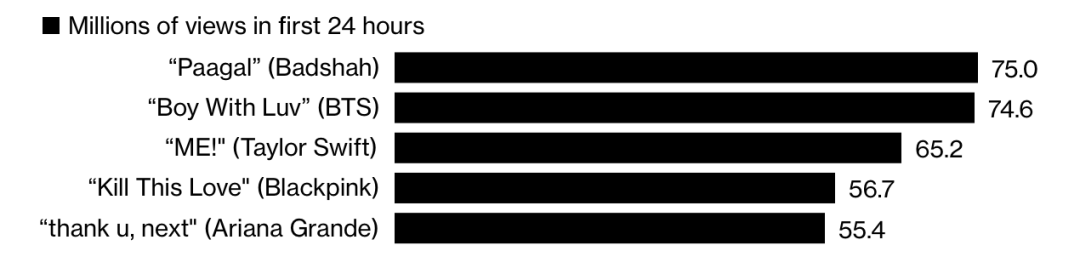 7月11日,印度说唱歌手BadShah的《Paagal》MV在上线24小时内获得了7500万次的播放量,打破了之前BTS feat Halsey的《Boy With Luv》MV所创下的7460万次的记录。然而,这一播放量却备受人们的质疑,一向热衷于宣传打破记录的Youtube也拒绝为索尼音乐旗下的这位歌手所背书。