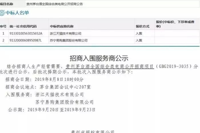 9月20日,贵州省招标投标公共服务平台发布了《贵州茅台酒全国综合类电商公开招商公示》,浙江天猫技术有限公司和苏宁易购股份有限公司入围。根据《公示》细则,天猫超市和苏宁易购的中标成功,意味着消费者将有机会在天猫超市和苏宁易购两大电商平台上以市场指导价1499元/瓶的价格买到53度500ml的飞天茅台。