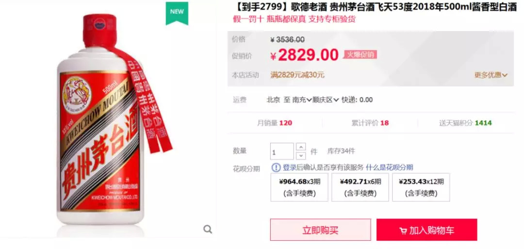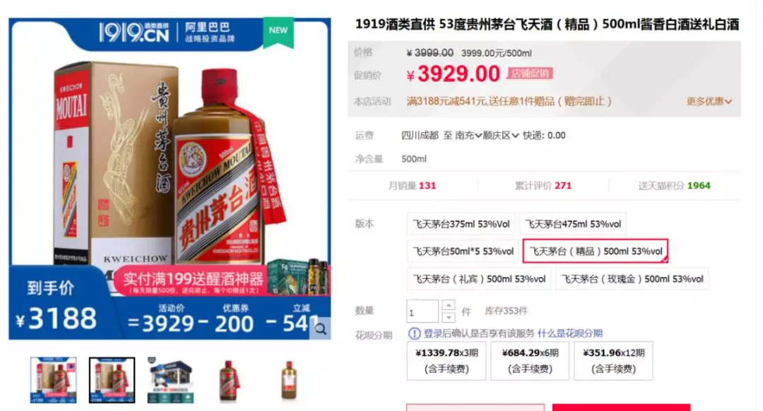 记者又在天猫搜索“53度飞天茅台”,壹玖壹玖的53度飞天茅台售价3929元,使用优惠券后的到手价是3188元。酒仙网官方旗舰店2018年的53度飞天茅台的价格是4499元,使用优惠券之后的到手价也高达2830元。歌德老酒行官方旗舰店出售的2018年53度飞天茅台价格为2829元,到手价是2799元。