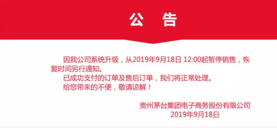 9月22日下午,《华夏酒报》记者进入茅台官方商城发现,茅台电商公司公告,因系统升级,从2019年9月18日起暂停销售,恢复时间另行通知。