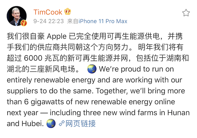 对此,Apple CEO库克也发微博表示,“我们很自豪Apple已完全使用可再生能源供电,并携手我们的供应商共同朝这个方向努力。明年我们将有超过6000兆瓦的新可再生能源并网,包括位于湖南和湖北的三座新风电场。”