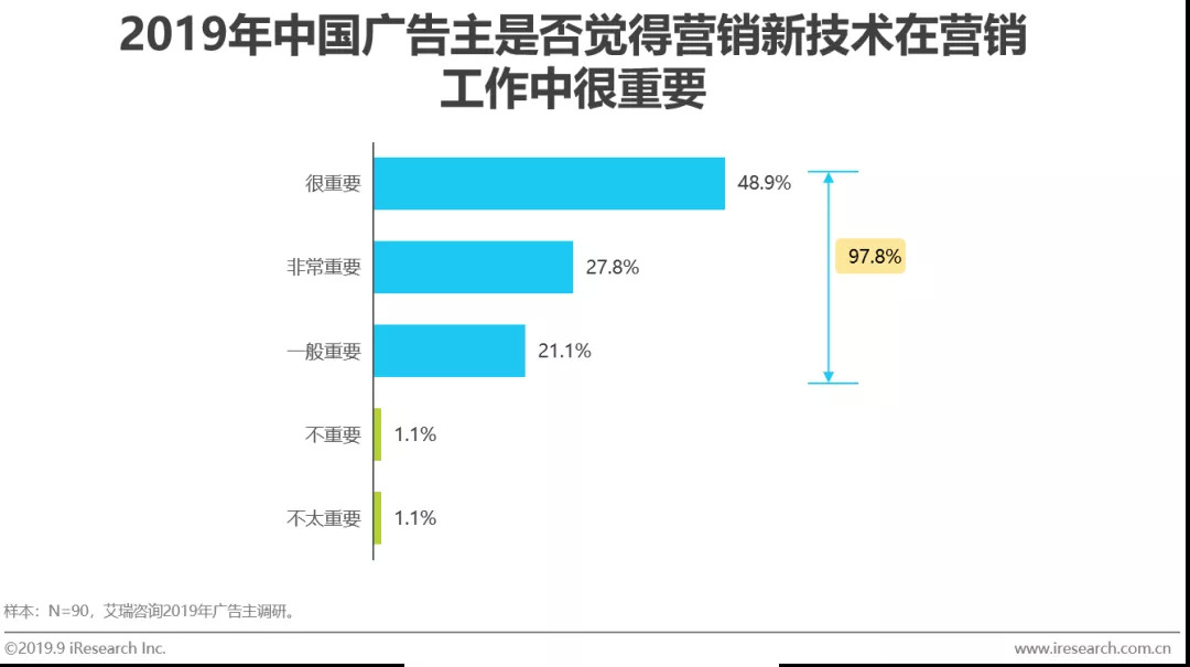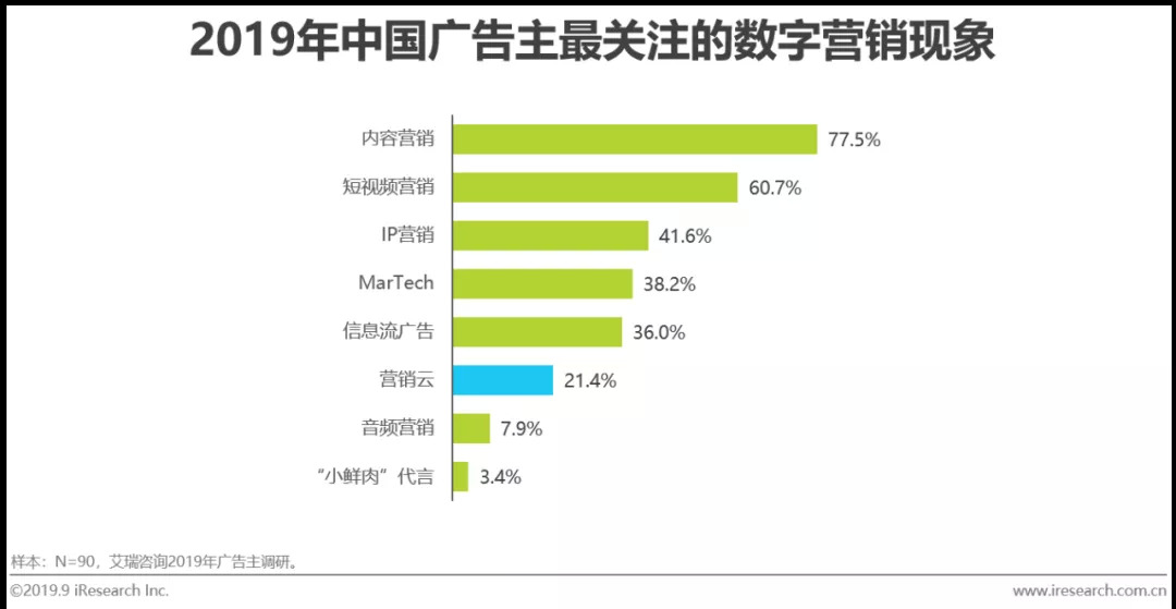 根据艾瑞咨询的广告主调研数据显示,1)超九成广告主认为营销新技术在营销工作中很重要,而只有不到七成的广告主认为自身企业在营销新技术的使用程度是较好的,整体来看营销技术的认知程度和使用程度之间仍然存在明显间隙,这主要是由于广告主对营销技术的认知还停留在技术本身层面,对其在具体场景中应用落地的解决方案的认知仍需进一步提高。2)尤其营销云作为当前重要的提供营销解决方案的服务平台,在广告主的关注度中仍然较低,仅占21.4%,远远低于内容营销、短视频营销等应用场景和效能都更加易懂的营销现象,营销云到底能够为企业解决哪些问题,发挥什么作用,仍然是国内很多广告主的困惑和观望的原因。
