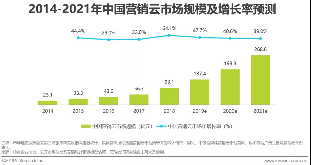 市场规模:2018年中国营销云市场规模为93.1亿元,增长率为64.1%。未来几年,伴随中国企业对数字化转型探索的成熟以及更多营销场景的应用落地,预计2021年规模将超250亿;