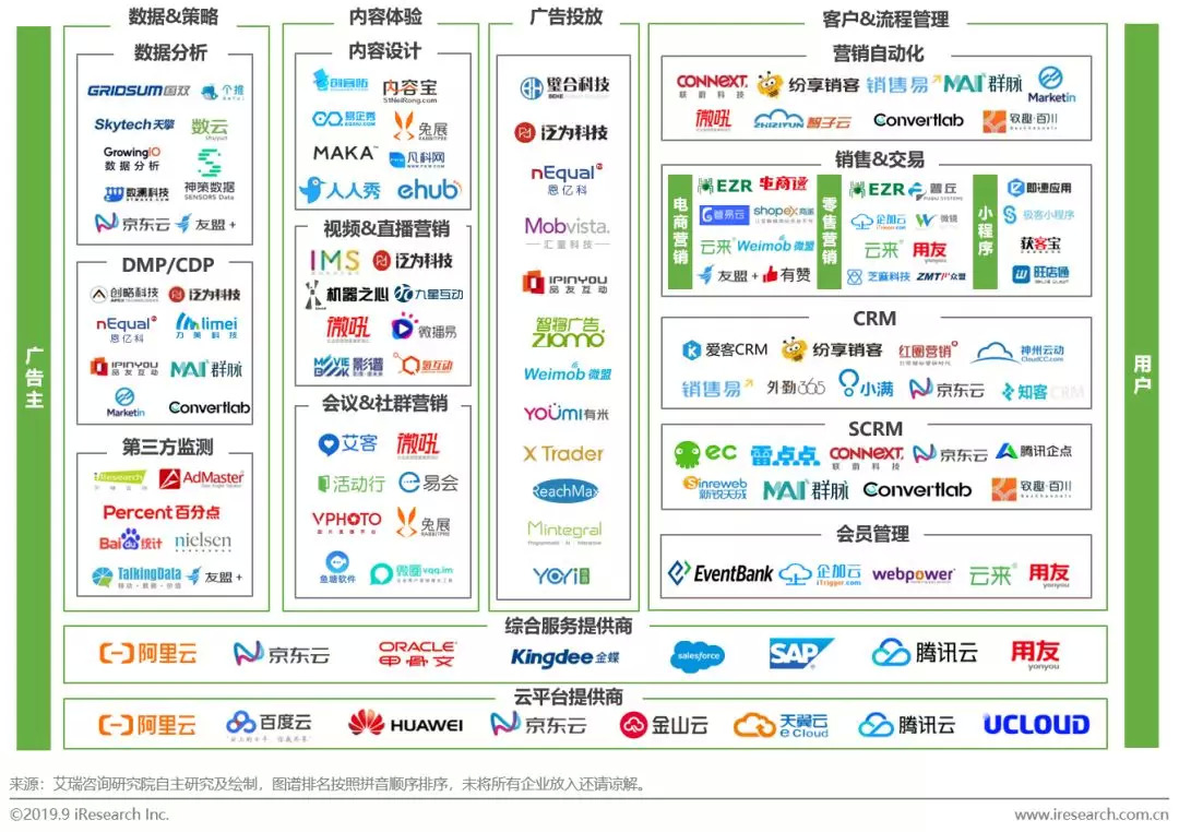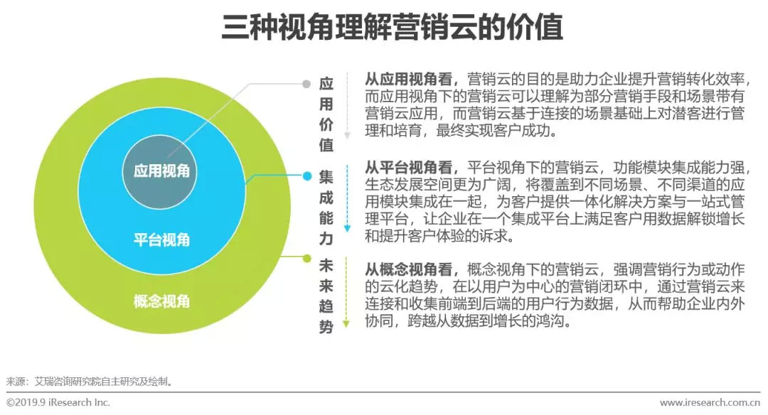 目前,市场上没有明确的营销云定义,维基百科将营销云定义为一套营销系统,提供了集成在线营销和网络分析产品的集合。而Salesforce则将营销云描述为:“营销云平台,为企业提供高相关性、个性化的营销旅程,跨越平台和设备的限制,让企业能够在正确的时间,将正确的信息传递给消费者。”但在中国市场下,营销云的定义理解又有所不同。艾瑞分析认为:基于中国的市场环境,营销云可从三种视角去理解。