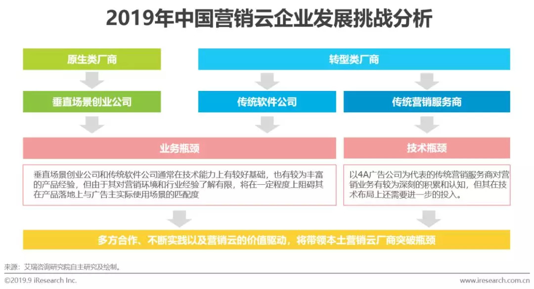 如前文论述,基于中国独特的媒体生态和营销环境,国外成熟的营销云厂商在进入中国市场都会遇到不同程度的“水土不服”,因此国内营销云市场的发展大旗开始由本土厂商肩负。从目前来看,国内本土营销云厂商主要可以分为两大类别,一是原生类厂商,基于垂直场景从零到一开始搭建的新兴创业厂商,二是转型类厂商,既包括传统软件公司在“云化”战略升级中向营销场景的拓展,也包括传统营销服务商从前端广告服务向后端营销技术的拓展。无论是原生类还是转型类,其在营销云产品搭建中均会遇到各自的瓶颈和困境,而未来合作和实践将是打破瓶颈的重要手段。