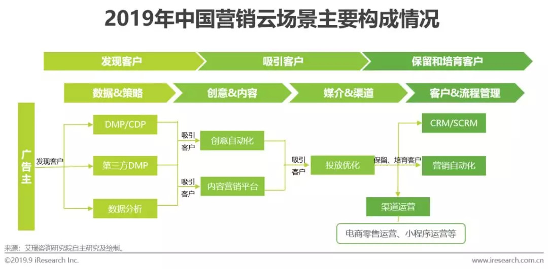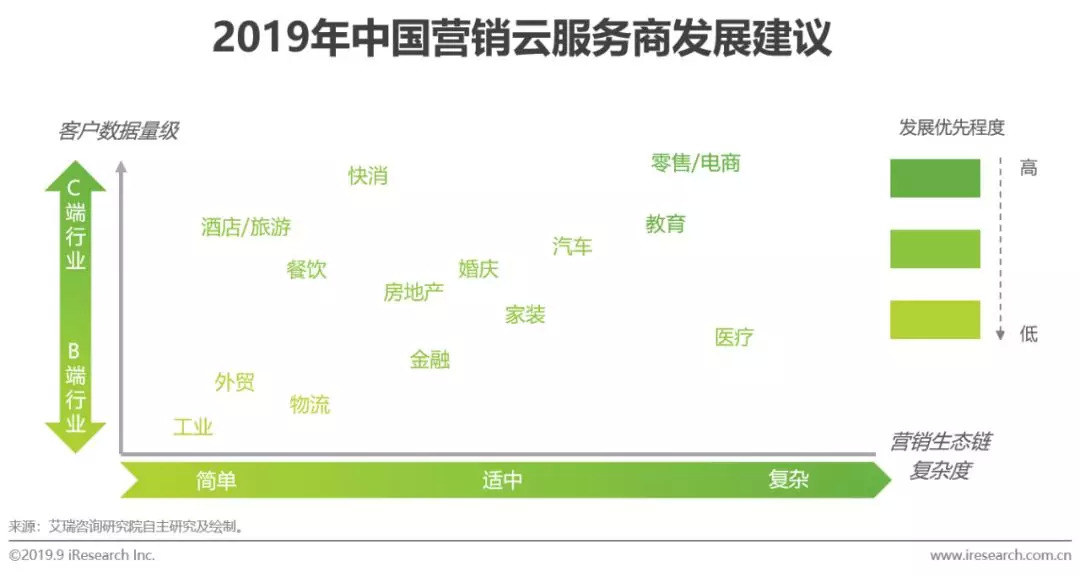 从根本上来讲,广告主营销上云的意愿程度,最主要还是由上云后所产生价值的迫切程度决定。尽管不同行业营销的本质都是发现、吸引、保留和培育客户,但由于各行业在营销生态链和客户数据量级的不同,营销上云后产生的价值程度也有所差异。通常来看,营销生态链条越复杂,周期越长,客户数据量级越大,上云后来带的成本优化、效率优化以及对客户的营销效果优化都会有更大程度的提升,但对应来看对营销云服务的要求也会更高。因此,营销云厂商在业务拓展时也会更多考虑不同行业的应用价值和自身能力,用综合型营销云产品去打通跨行业的基础服务,用专业型营销云产品去深耕垂直行业的精细化服务,而垂直型营销云产品的发展轨迹也将从行业营销生态链由深向浅辐射。