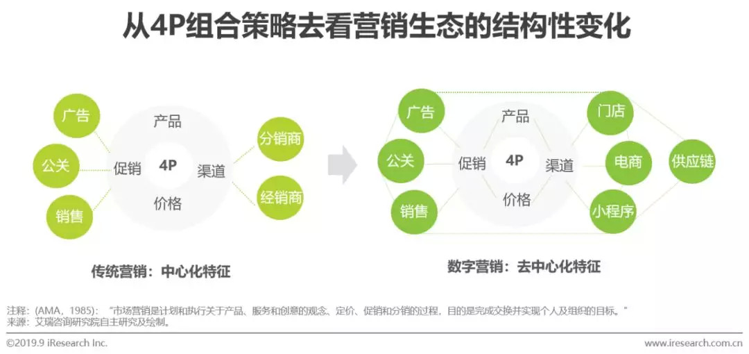 提及营销,就会讲营销4P,4P是美国营销学学者杰罗姆·麦卡锡教授提出的“产品、价格、渠道、促销”的首字母缩写。但聚焦国内市场去看,互联网爆发前的4P从产品诞生到价格再到促销及分销,“中心化”特征明显,每个内容版块都有1-2个中心结构在支撑其内部生长和发展,并呈放射状形态。而在互联网时代,尤其移动互联网时代,技术的发展使去中心化的信息传播成为现实,因此由4P连接的营销生态“去中心化”特征明显,并呈网状形态,同时,每个节点都可能成为阶段性的中心,节点与节点之间也会相互影响。