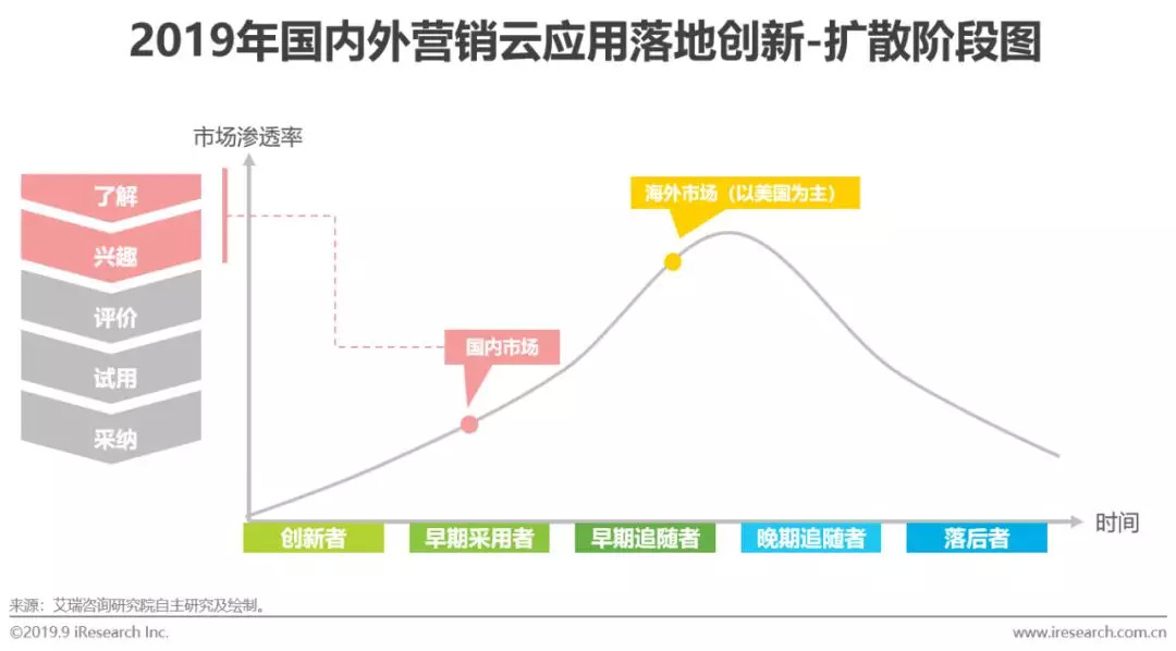 营销云作为一个新概念,进入国内市场的时间尚且较短,再加上其包含着技术创新、产品功能创新、服务创新及合作模式创新等多重创新维度,使得中国营销云市场还处在一个发展初期。相比于以美国为代表的海外市场,国内营销云在应用落地的普及度和渗透率上仍有存在着阶段层的滞后性。结合美国社会学家罗杰斯提出的创新扩散理论,艾瑞分析认为当前国内营销云的创新扩散还停留在早期采用者阶段,大部分企业对营销云的创新接受与决策过程还在了解和兴趣阶段,要赶上海外市场的普及度,时间是必要条件。