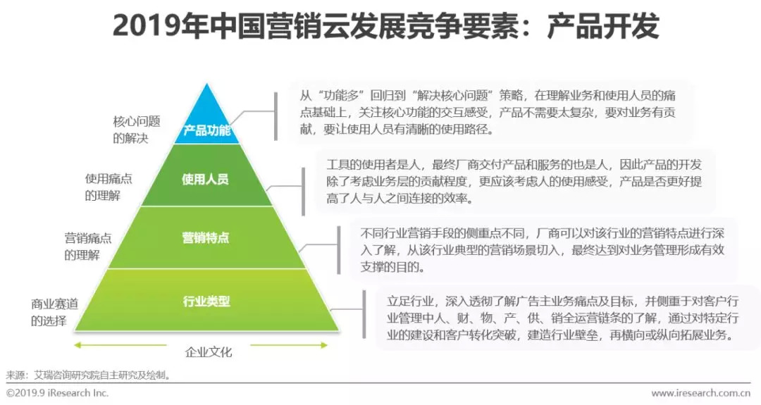 虽然SaaS模式要求产品标准化,但中国大多数行业和企业定制需求明显,用一套标准化的服务模式很难满足不同客户的需求。1)与此对应的并不是厂商切入的行业越多,盈利越快,也并不是产品功能越多越能解决企业的痛点,尤其营销行业营销触点和用户场景众多,大而全的产品开发思维,会影响产品的运行效率和使用体验。2)因此,建议营销云厂商的产品定位遵循“客户行业×营销特点×使用人员×产品功能”的矩阵图。3)自下而上的思考要切入的行业赛道,要解决的特定行业或特定业务的痛点,要了解该行业的营销特性,要捕捉客户产品功能的开发和解决方案的制定。最终通过自上而下的沟通和服务,持续的满足客户需求和帮助客户实现销售增长。