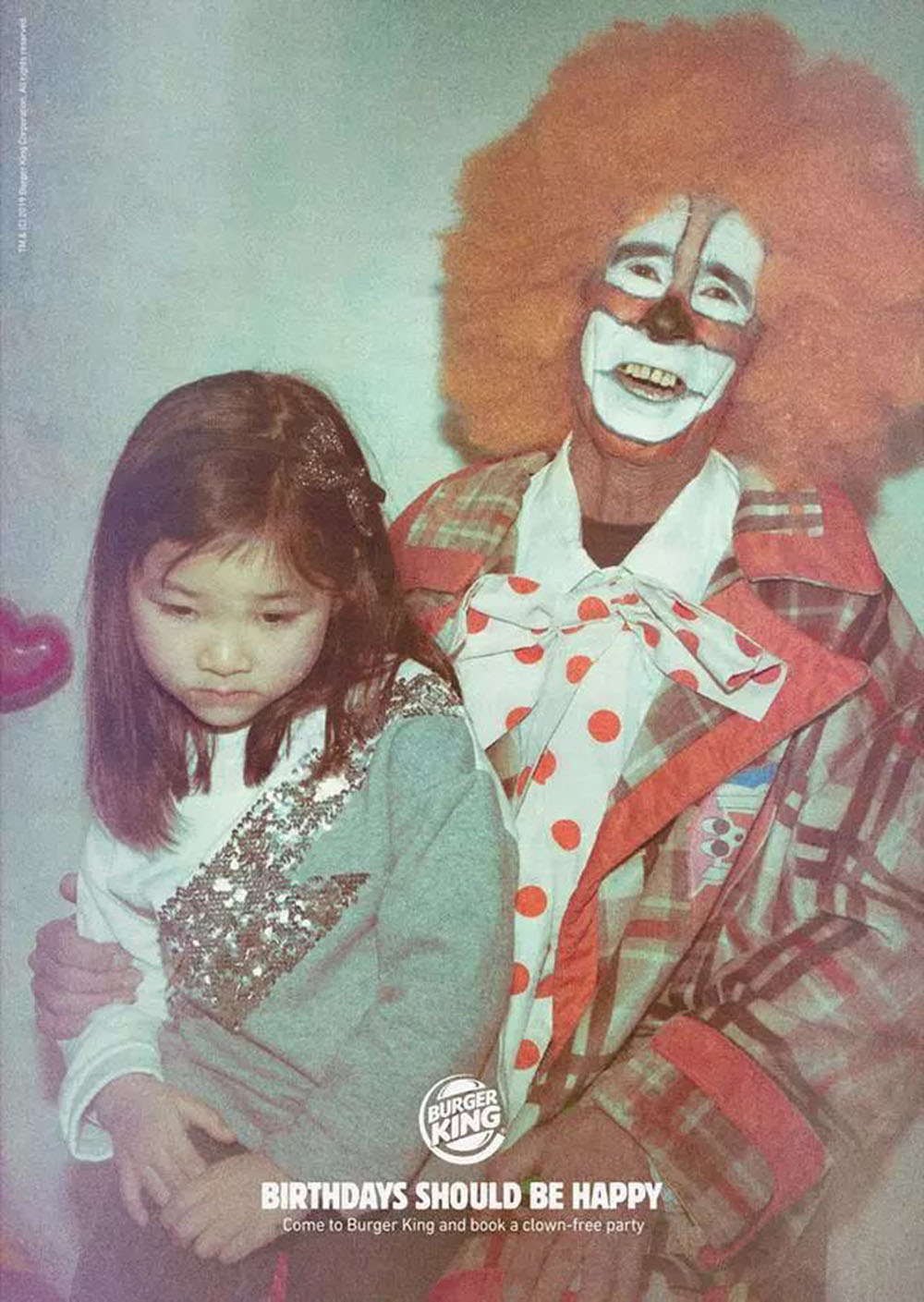 这不是汉堡王第一次用小丑做文章,今年5月,汉堡王联合西班牙创意机构LOLA MullenLowe推出了一系列海报,用“Birthdays Should be Happy”告诉家长们:“别闹了,你还想在生日派对上吓哭你们家孩子?来汉堡王吧,这里可没有小丑哦。”