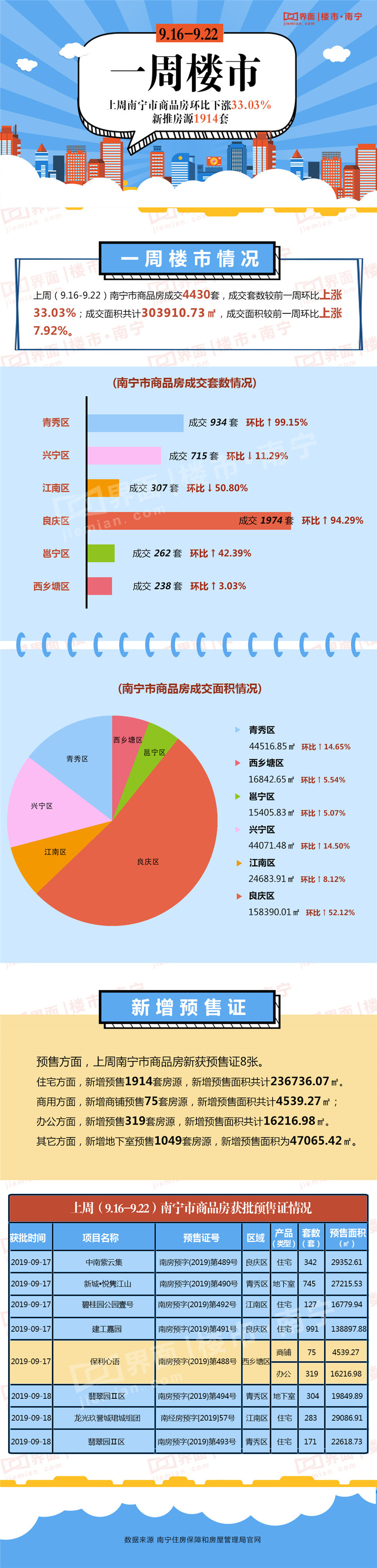 据统计,上周(9.16-9.22)南宁市商品房成交4430套,成交套数较前一周环比上涨33.03%;成交面积共计303910.73㎡,成交面积较前一周环比上涨7.92%。