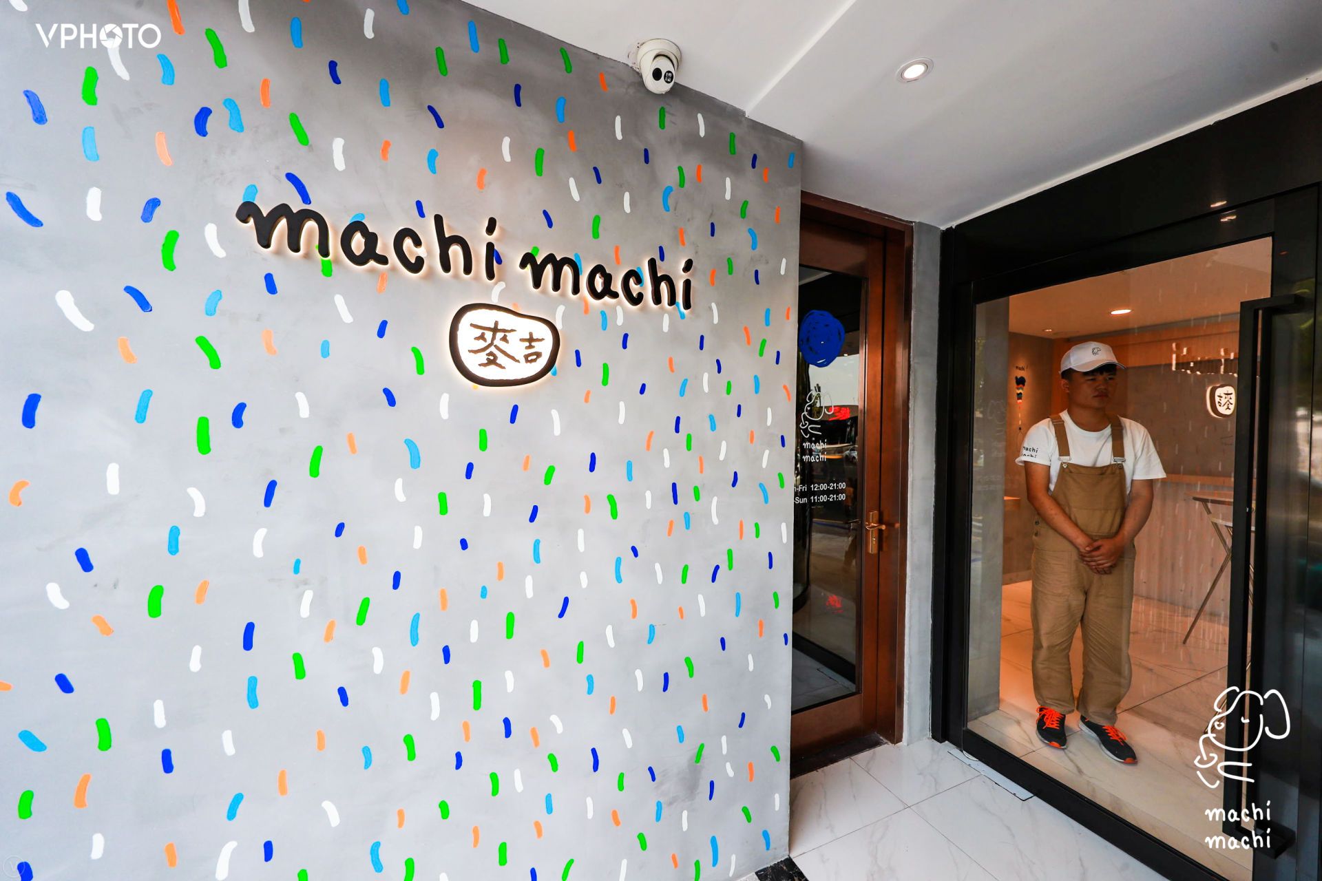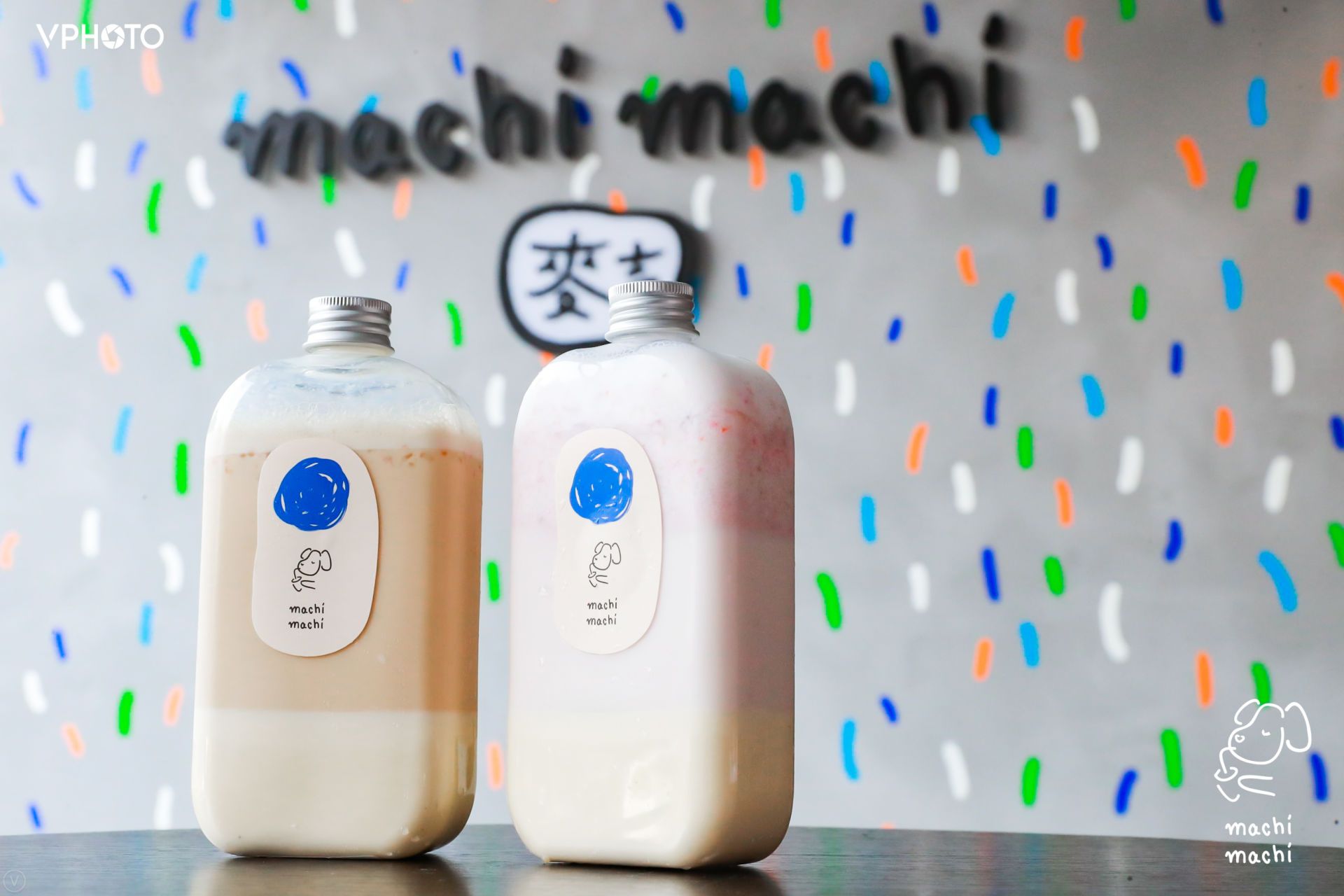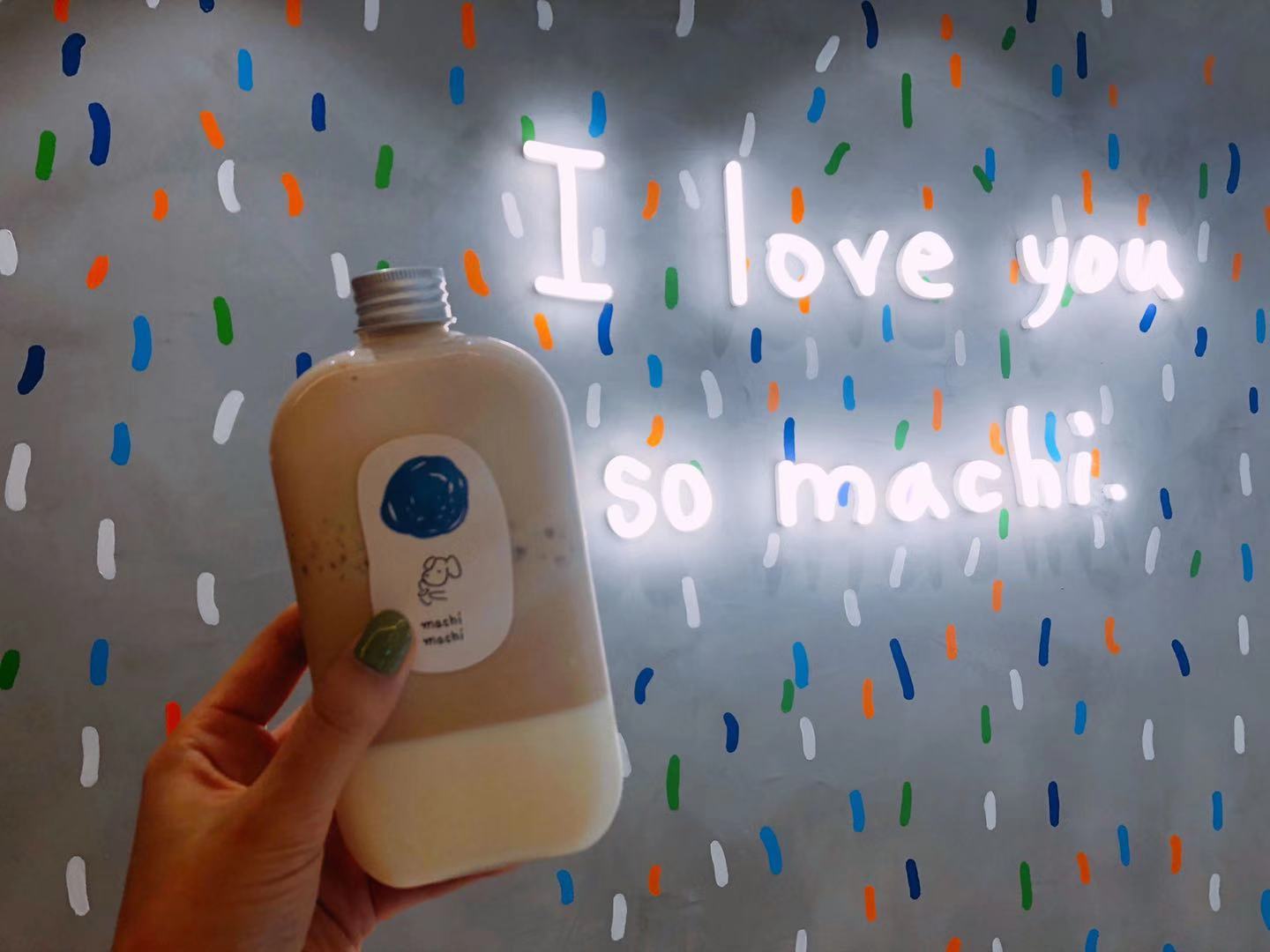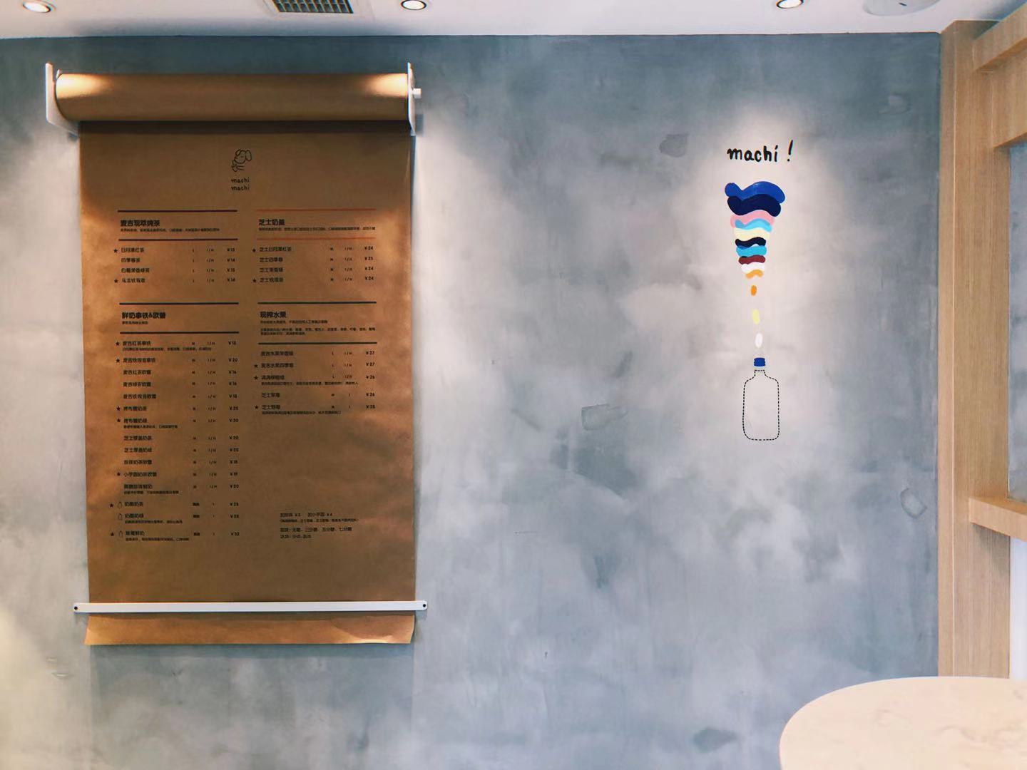 快闪店位于外滩中山东二路12号,对面就是游客量巨大的黄浦江游船码头摆渡口。门店面积并不大,内有两个站立式小桌;店铺内装修也以灰色的工业风墙壁与简单的彩色线条为主,墙壁上有麦吉奶茶代表性的“I love you so machi”标语,和一些画风清新的手绘图案。