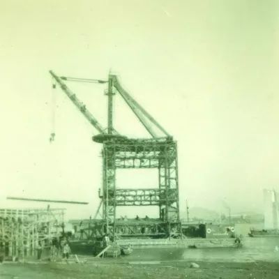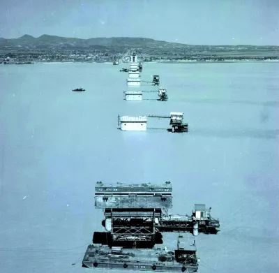 图/1960年1月18日,长江大桥主体工程正桥桥墩开工,正桥9号墩钢围笼浮运下水,大桥建设全面启动。