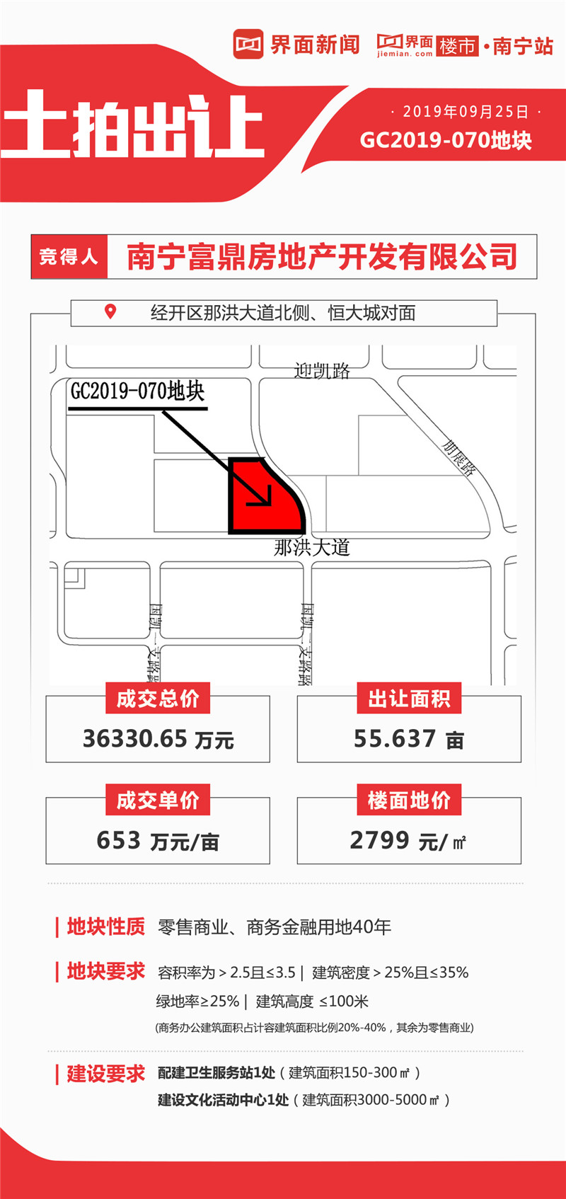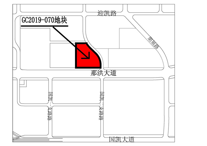 GC2019-070地块位于经开区那洪大道北侧、恒大城对面,实际出让面积37091.02平方米(折合55.637亩),宗地号:450105450001GB00404。土地批准用途为零售商业、商务金融用地;土地使用年限为40年。