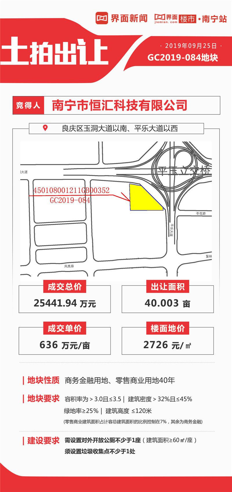 GC2019-084地块位于良庆区玉洞大道以南、平乐大道以西,宗地号为450108001211GB00352,实际出让面积为26668.70平方米(折合40.003亩),土地批准用途为商务金融用地、零售商业用地,土地使用年限为40年。