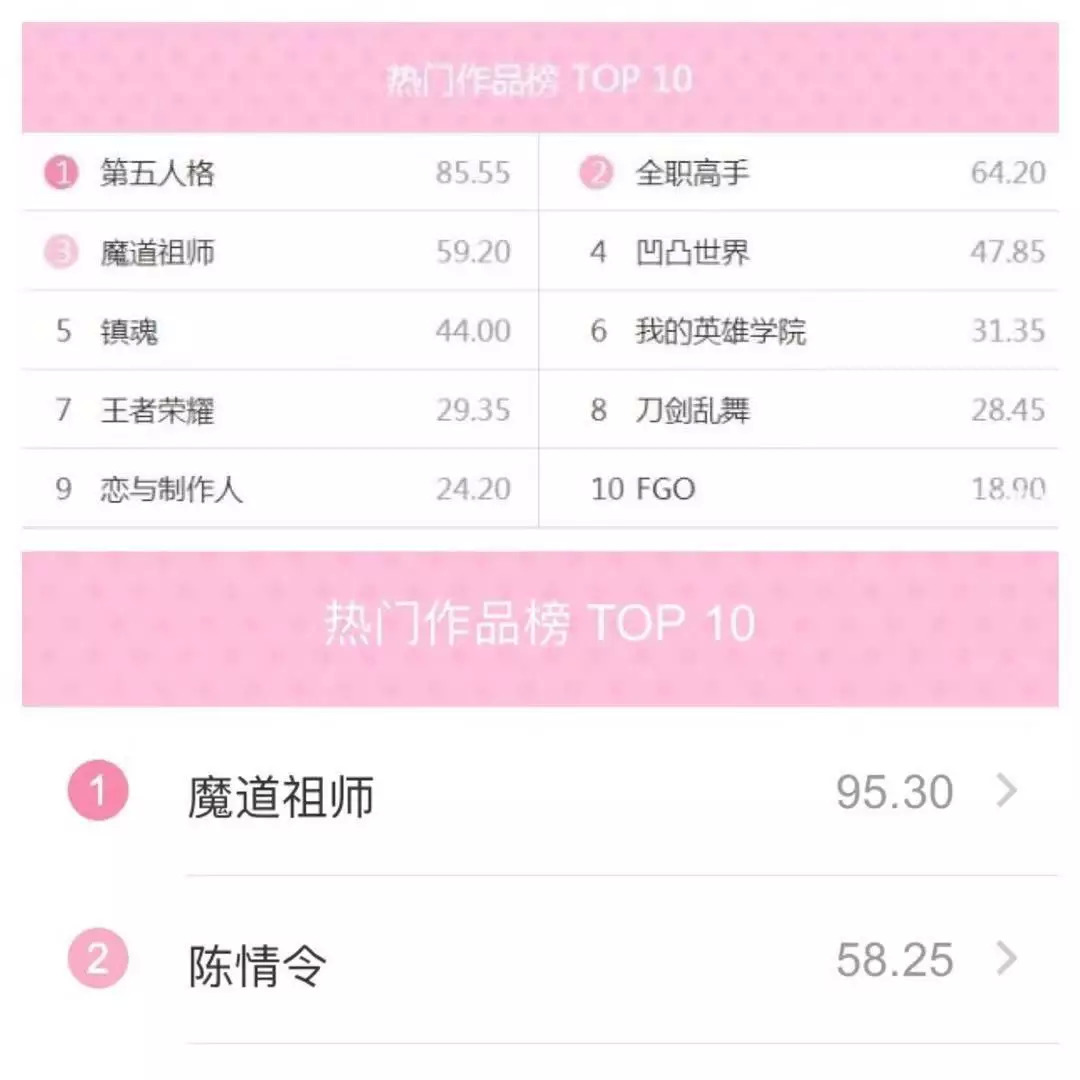 数据显示,2019年3月,《陈情令》尚未播出之时,《魔道祖师》位于lofter热门作品榜第三位,指数83.90,被《第五人格》与《凹凸世界》超过,到现在《魔道祖师》已经稳坐榜单第一,指数达到95.30。今年7月忘羡tag参与人数13万,现在增加到16.8万左右。