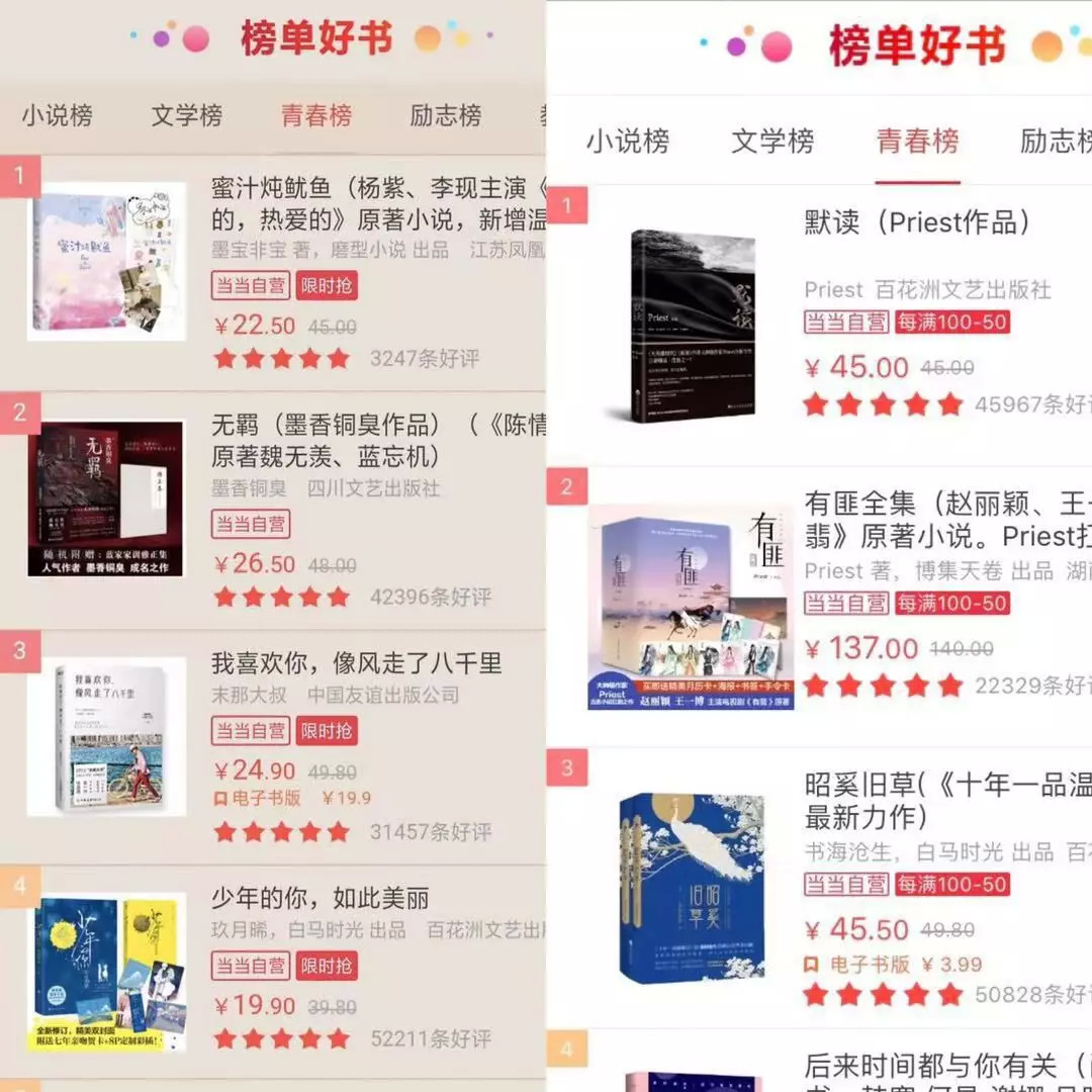 同时,在《陈情令》《亲爱的,热爱的》播出期间,原著小说出版书籍销量也明显增长。7月15日,当当网图书榜单好书青春榜上,《蜜汁炖鱿鱼》《无羁》(《魔道祖师》重印出版名称)分列榜单一二位。现在随着新的IP改编剧集的公布,该榜单头两名已经被Priest的《默读》《有匪》占据。