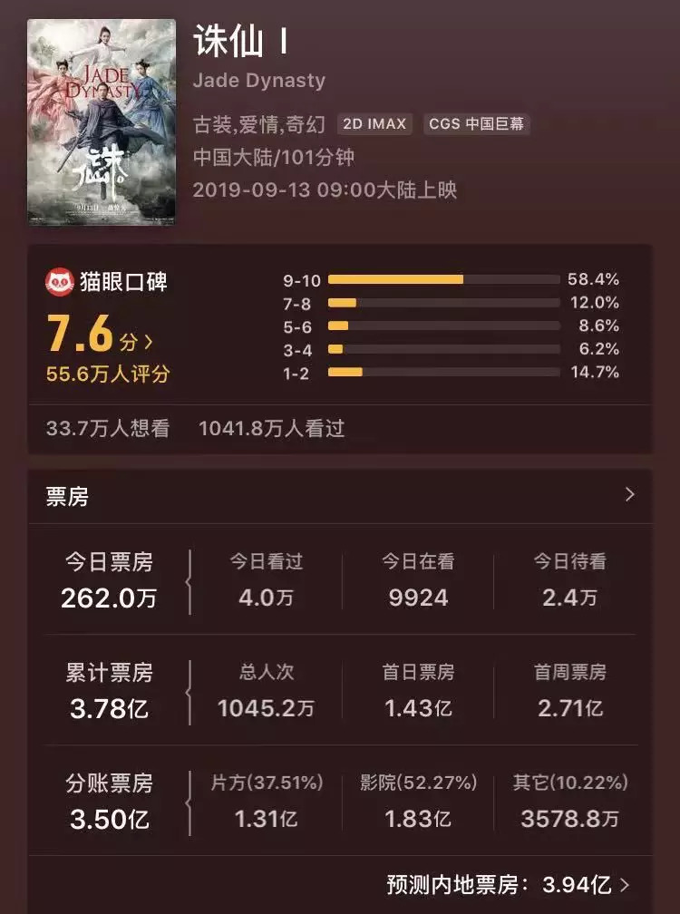 截至写稿时间,IP电影《诛仙I》累计票房3.78亿,这个数字证明流量鲜肉犹有未尽的票房置换力,顺带给史上最凄凉的中秋档增添了一丝暖意,但是对于《诛仙I》背后牵涉的各类公司而言,喜忧参半。