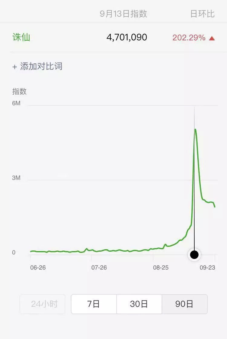 微信指数近90天内也因《诛仙I》热度达到过一次高峰,9月13日电影上映当天“诛仙”关键词微信指数环比上升202.29%。