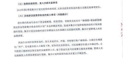 该资管计划二季度托管报告显示,截至2019年6月30日,集合计划份额净值为0.477元。在托管报告中,爱建证券做出风险提示称,凯迪生态现阶段债务违约、发生多起诉讼仲裁,财务状况集聚恶化,司法重整具有重大不确定性,管理人无法就融资人的债务清偿进行预测,集合计划的投资回收具有重大不确定性。