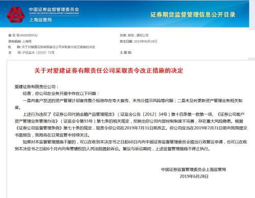 今年6月,上海证监局发布监管措施显示,爱建证券存在向客户发送的资产管理计划宣传推介短信存在夸大宣传、未充分提示风险等问题,且未及时更新资产管理业务相关制度。基于此,上海证监局认为爱建证券内部控制制度不完善,存在重大风险隐患,责令其在7月31日前改正并提交书面报告。