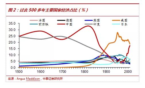 从2000年历史的维度来看,我国经济经历了从领先到落后到再崛起的过程。在19世纪之前,我国和印度是全球经济的“领头羊”,经济总量占比都在20%以上。