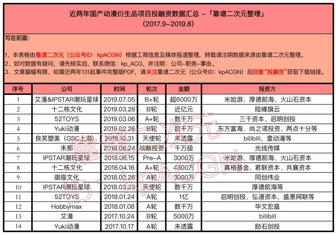 靠谱编辑部(ID:kpACGN)以2018年8月为节点,盘点了前一年(2017.9-2018.8)及后一年(2018.9-2019.8)连续两年的131起动漫领域投融资事件,从公司细分行业、轮次、融资额、资方等多方面逐一分析,以期用最直观的数据呈现2年来的行业动态。