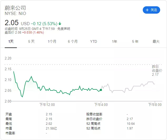 受财报不利影响,蔚来24日股价大跌0.55美元,报收于2.17美元,跌幅高达20.22%。截至发稿前,25日蔚来股价继续下跌5.53%至2.05美元,市值仅剩21.58亿美元。