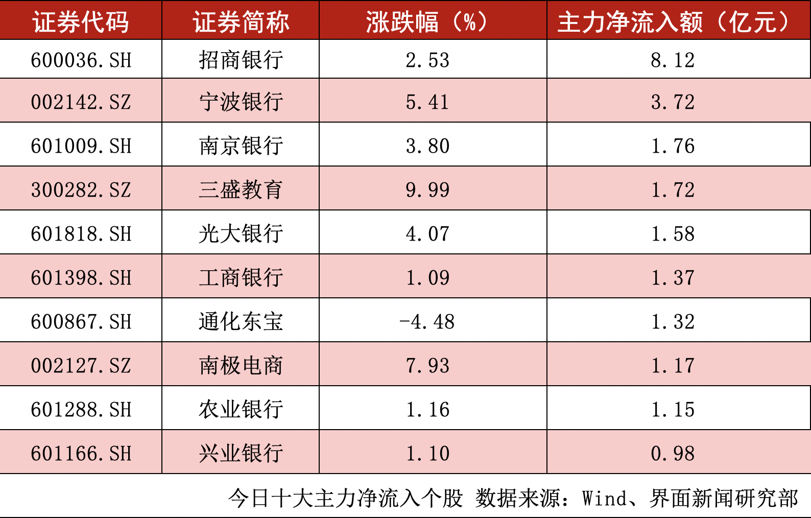 剔除尚未开板的新股及科创板股票,全天沪深两市主力净流入额超过1亿元的个股数量仅为9个。招商银行(600036.SH)、宁波银行(002142.SZ)、南京银行(601009.SH)的主力净流入额位居前三,分别为8.12亿元、3.72亿元、1.76亿元。