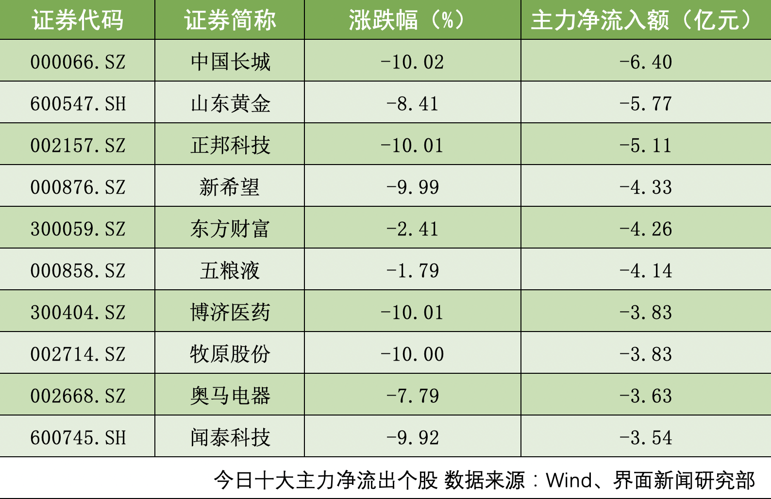 沪深两市共计93只个股主力净流出额超1亿元。中国长城(000066.SZ)、山东黄金(600547.SH)、正邦科技(002157.SZ)主力净流出额位居前三,分别为6.40亿元、5.77亿元、5.11亿元。