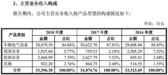 据招股书,研奥电气的主营业务包含车辆电气设备、线束服务、检修业务、其他等四项。其中,车辆电气设备报告期内的收入占当期主营业务收入的比例均在80%以上,可以说是研奥电气的拳头产品。