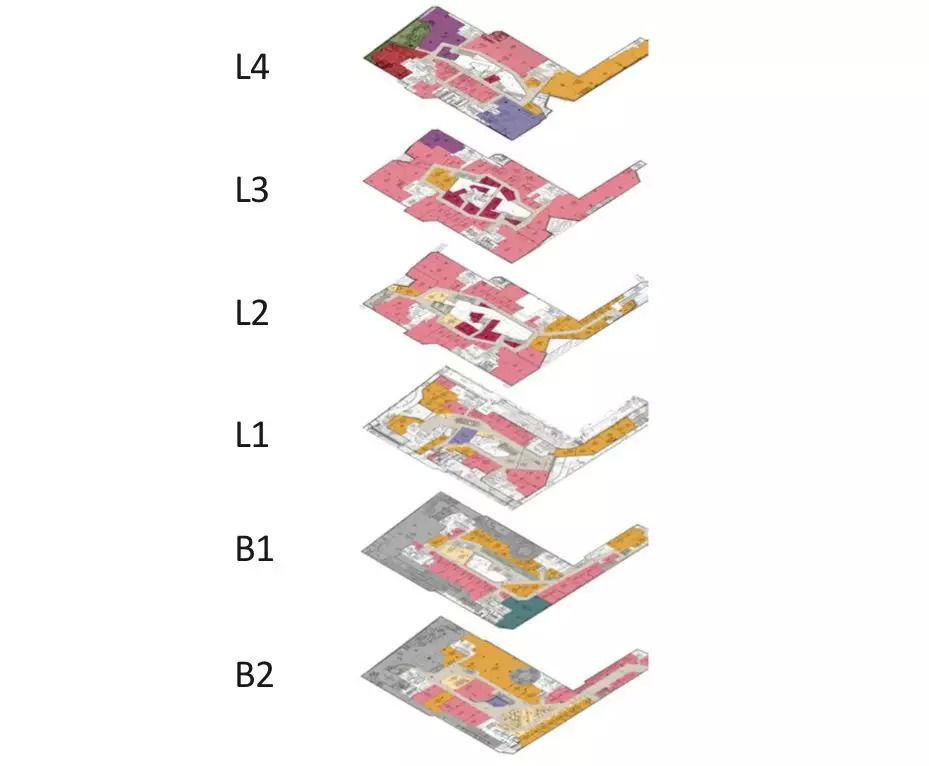从楼层平面图可以看出,Funan Mall 在业态规划上切割了水平空间,2~3层的零售业态在垂直面上形成了自然分区,用业态内部的跃层、打通,制造了场内业态的“立体感”。