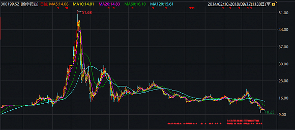 从股价方面同样也可以看出股民对其用脚投票的态度,2014年2月19日晚间,翰宇药业发布并购重组停牌公告。当日翰宇药业收盘12.94元,涨幅8.94%。此后公司股价快速上涨,到2015年4月14日,翰宇药业股价突破55元,随后腰斩至今萎靡不振。如今,面对翰宇药业投资者心中或许自有答案。
