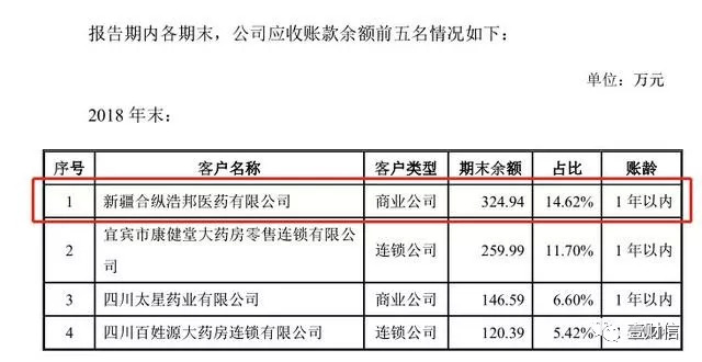 据招股书,由于新疆合纵浩邦2018年度的亏损,合纵药易购还付出了57.76 万元的投资损失。并且,在招股书披露的合纵药易购2018年末应收账款余额前五名中,新疆合纵浩邦还高居第一位。