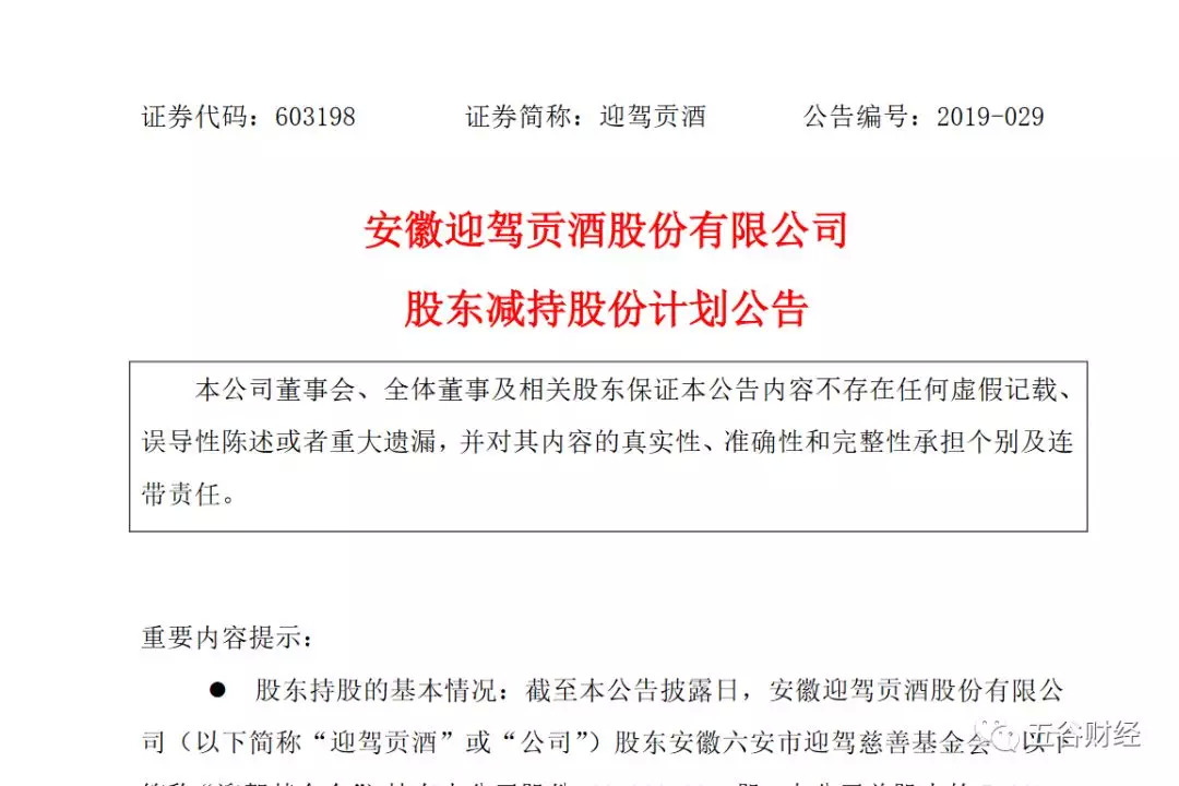 2019年9月24日,迎驾贡酒收到股东迎驾基金会发来的《关于股份减持计划的告知函》,迎驾基金会计划减持其所持有的迎驾贡酒股份。