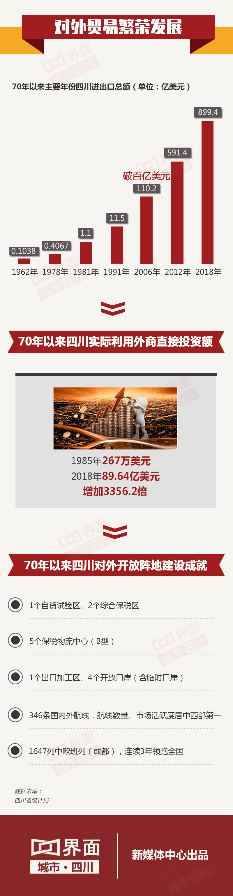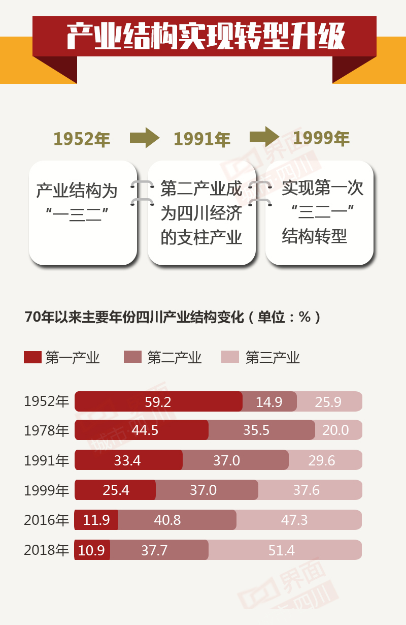 70年来,四川经济实力大幅提升,经济结构持续改善;农业、工业、服务业等飞速发展;对外贸易繁荣发展。