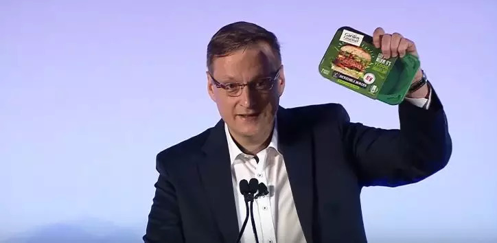 雀巢高管在2019年投资者会议现场展示旗下人造肉产品Incredible Burger