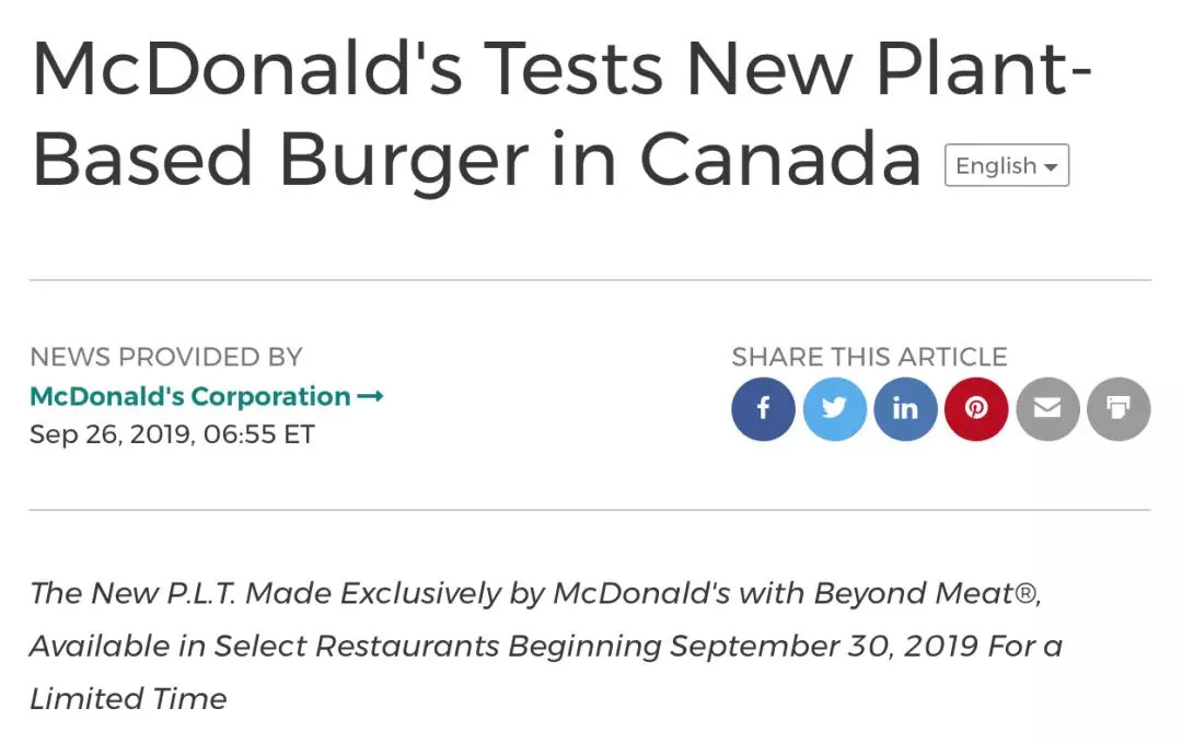 这家快餐连锁巨头在一份通报中表示,将于2019年9月30日开始在加拿大28家餐厅测试销售人造肉汉堡新品,售价为6.49加元(约合人民币35元)。这一测试将持续12周的时间。