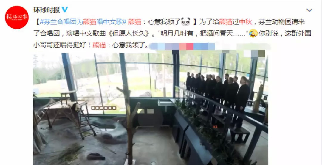前一阵子过七夕时,芬兰专门找了一个男声合唱团,去给大熊猫唱中文歌《但愿人长久》。
