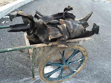 05:27【集装箱铁皮飞出一公里】住在1公里左右的工人,正在清理从事发地点飞来的集装箱铁皮,还有化学品灰尘在爆炸中飞落到这里。