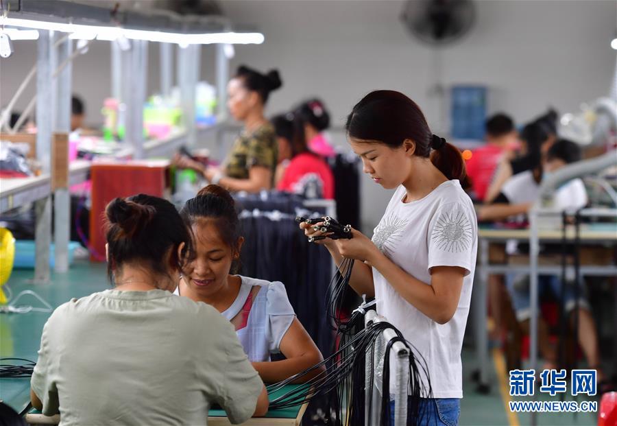 在广西融水苗族自治县苗家小镇小区的粤桂扶贫车间内,工人在生产手机数据线(8月26日摄)。2018年,融水减少贫困人口3.5万人,13个贫困村实现脱贫摘帽。 新华社记者 黄孝邦 摄